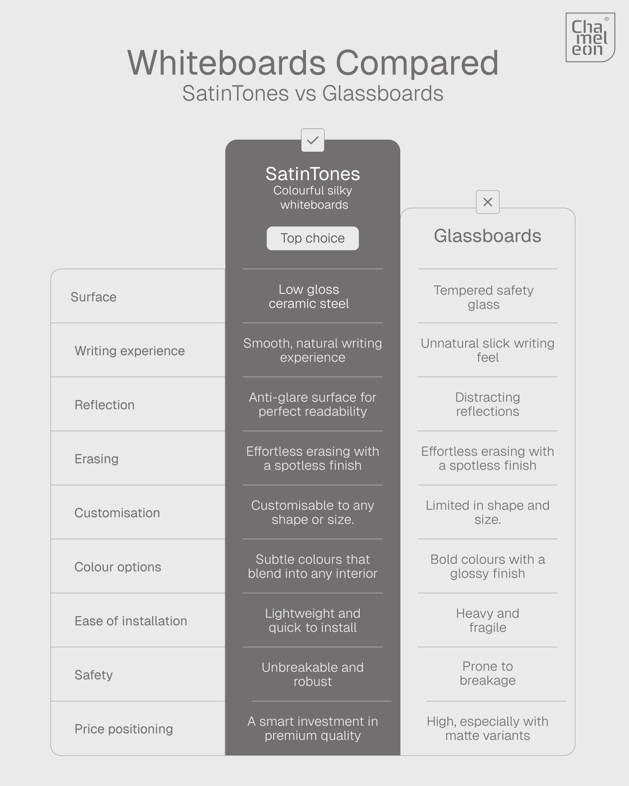 A whiteboard may seem like a minor detail in a project, but its impact on appearance, collaboration, and everyday use is significant. Glassboards are often chosen for their sleek, modern look, but luxury doesn’t always need to shine. Chameleon’s whiteboard with SatinTones offer an aesthetically equivalent alternative with a subtly matt finish that combines style, comfort, durability, and ease of use, well worth considering for interior architects, fit-out specialists, and end users in education or office environments.