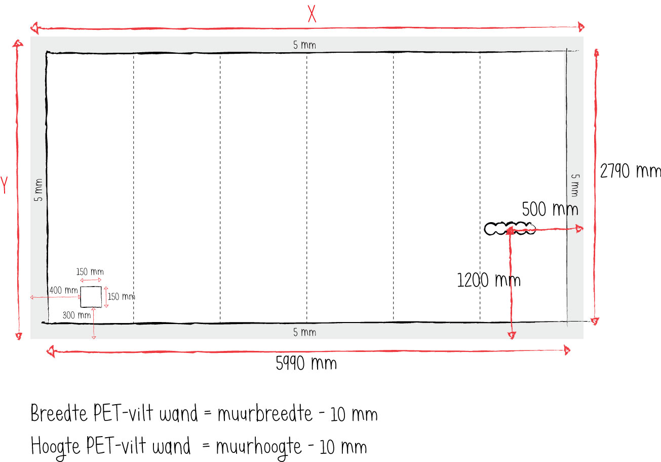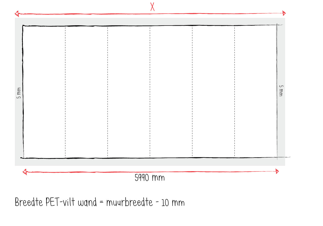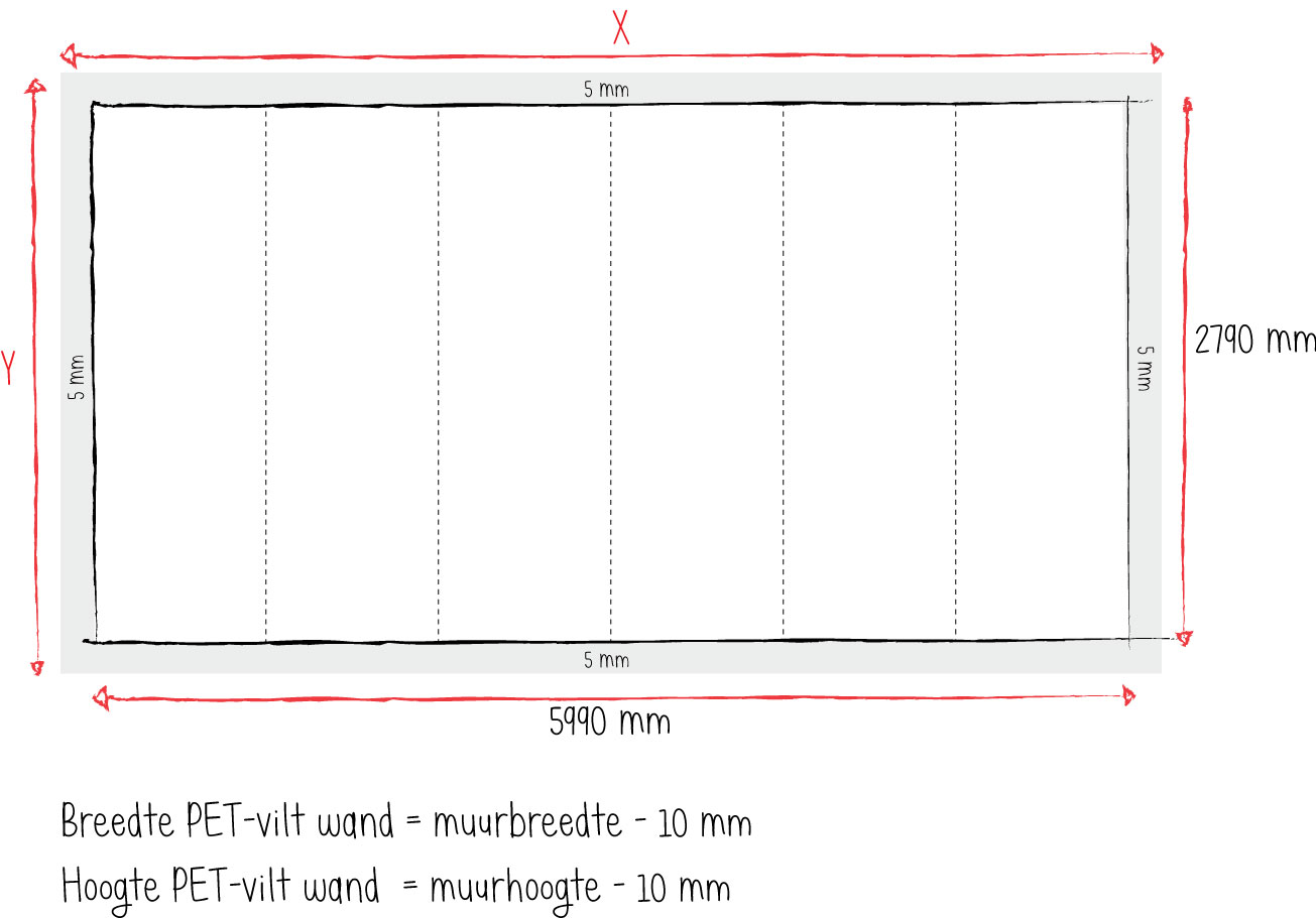 De afmetingen die overblijven, worden de maat van de PET-vilt wand dat je gaat bestellen of plaatsen. Zo weet je zeker dat alles netjes past.